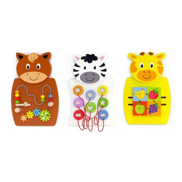 Set of wall activity panels to engage children in cross-curricular learning. Panels are styled as a brown horse with wire beads and moving gears, a yellow giraffe with fruit puzzle blocks to mix and complete, and a black and white zebra with colourful shapes to identify and match.