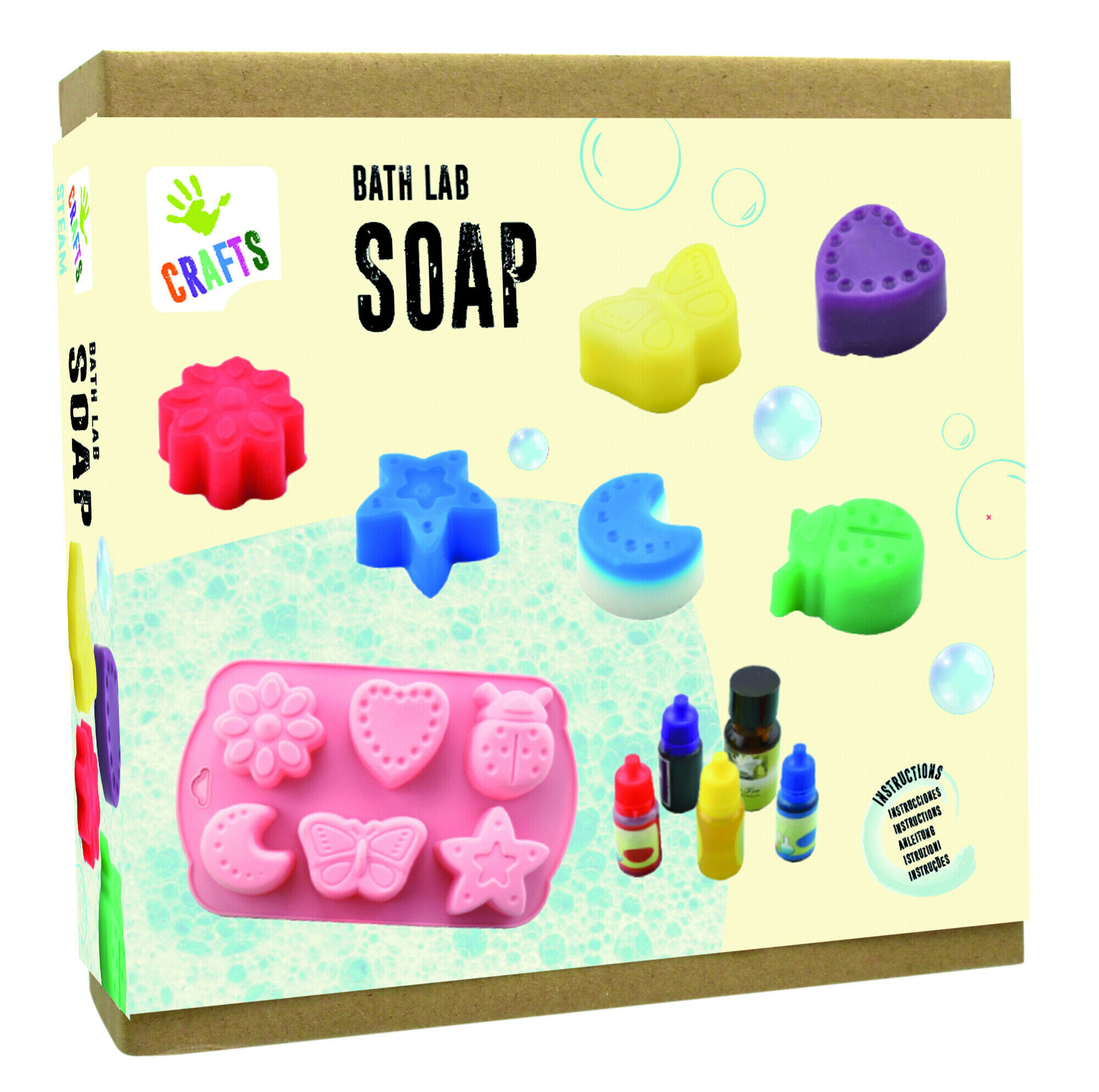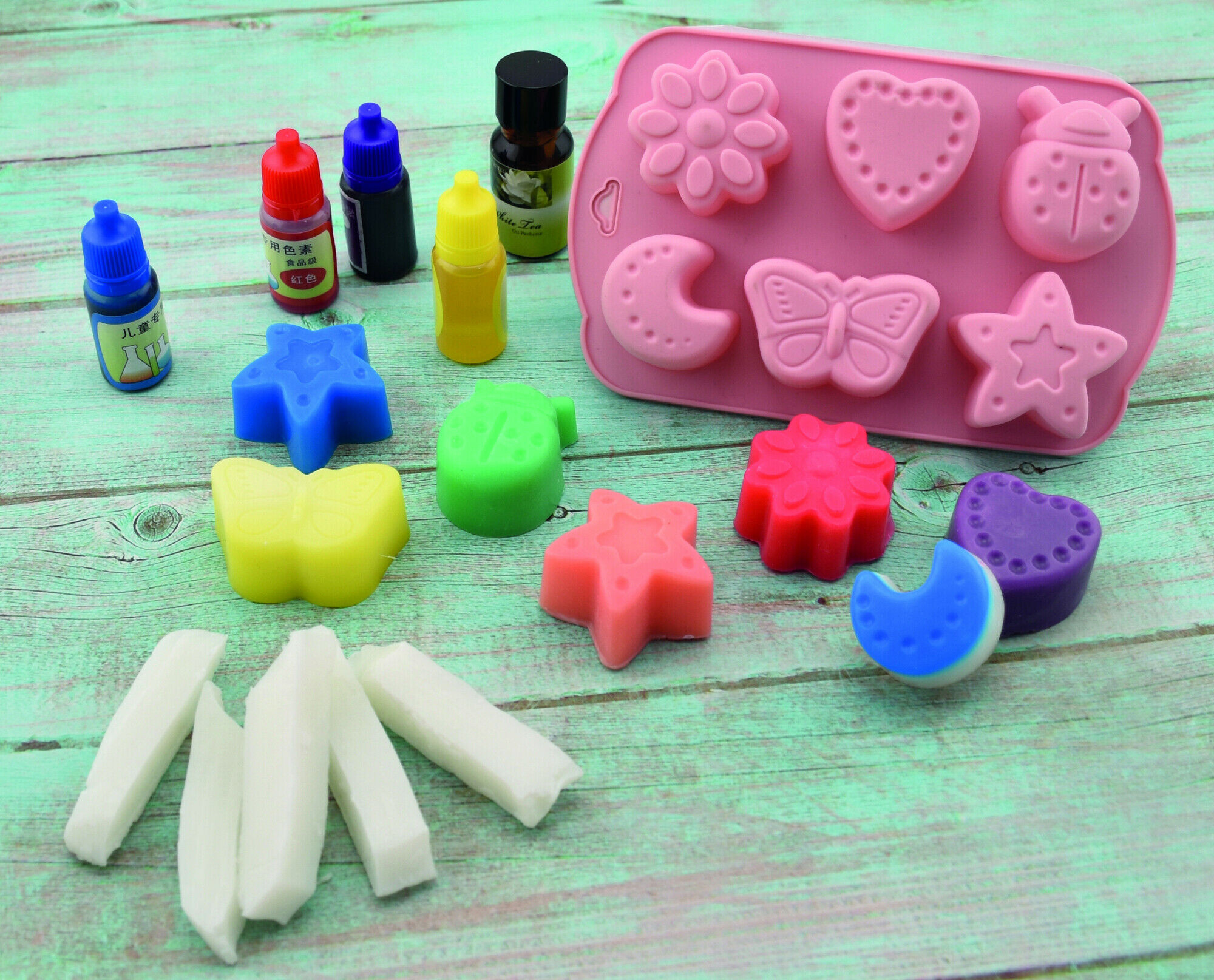 Melt the soap pieces to a certain temperature, then mix with the colored pigments and essential oil. Put the content into molds of various forms and keep in a cold environment. Then, you will get some the nicest soaps of various colors and shapes that smell of perfume. Content: soap, pigments, essential oil, mold and zip bags.
