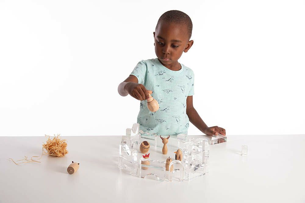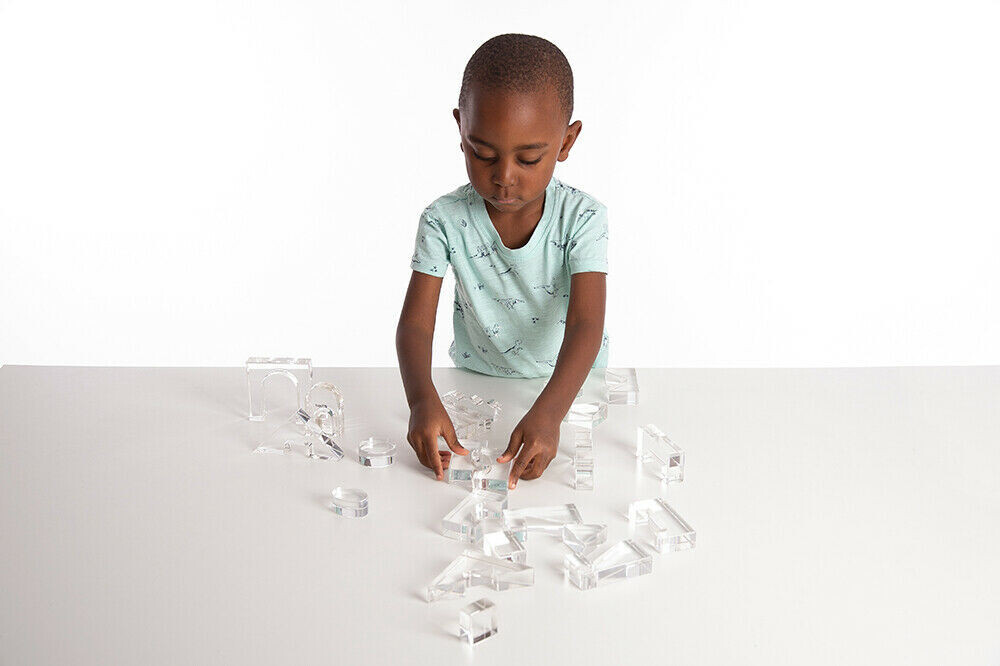 25 polished crystal clear acrylic blocks with smooth, tactile surfaces. The set contains 17 different shapes designed to encourage children to create patterns, sequences and imaginative pictures.