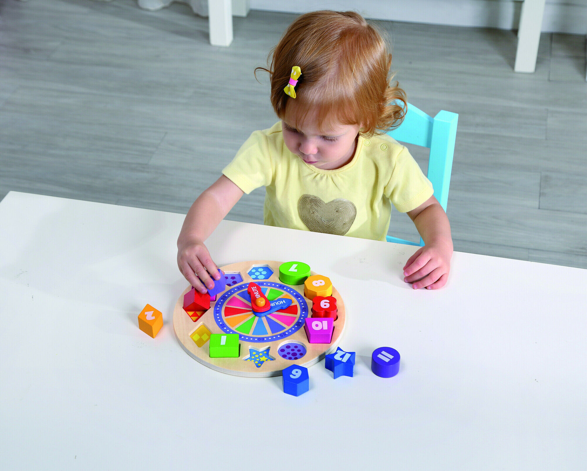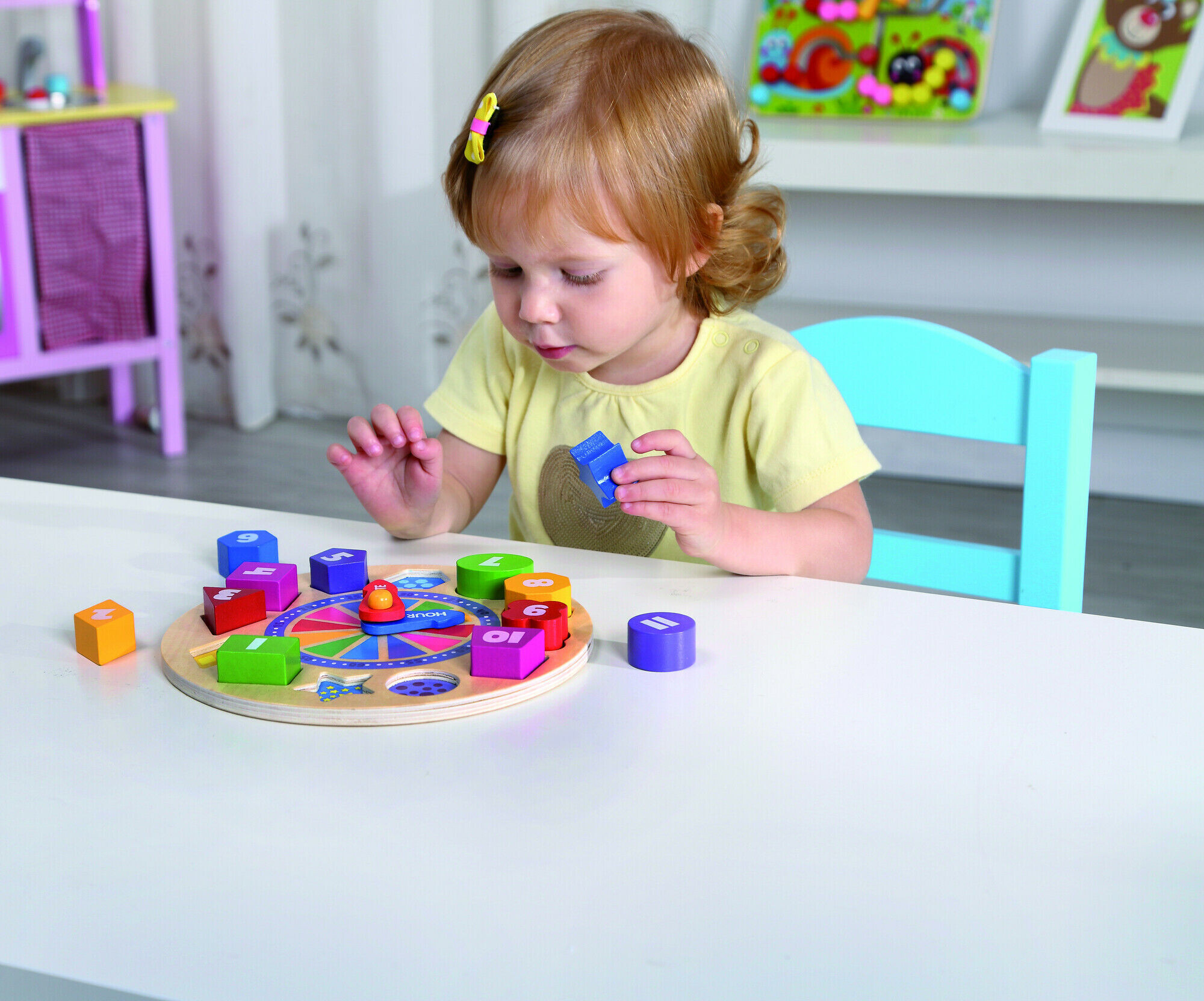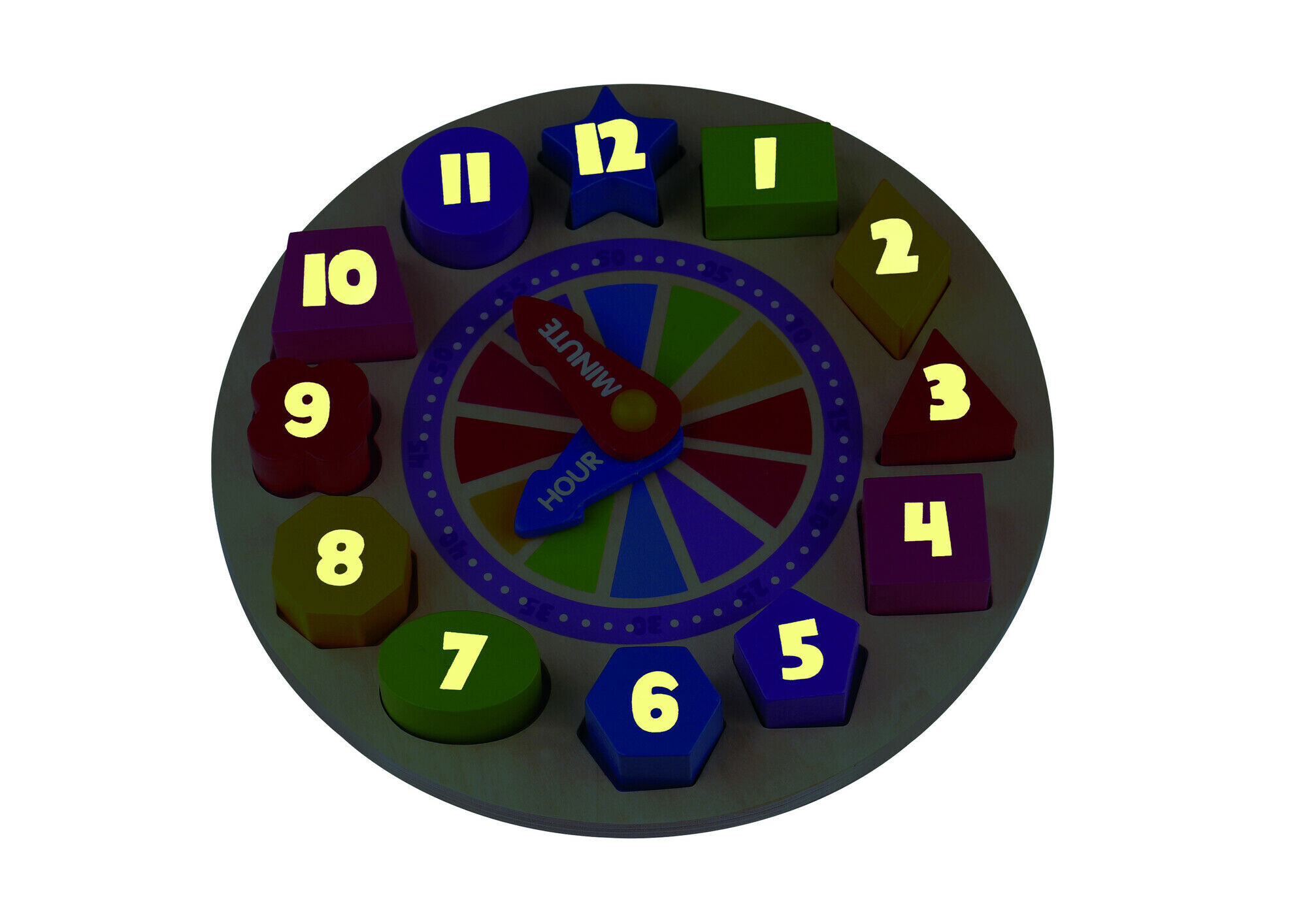 Clock puzzle to learn about shapes, colors, numbers, hours and minutes. Glow in the dark!