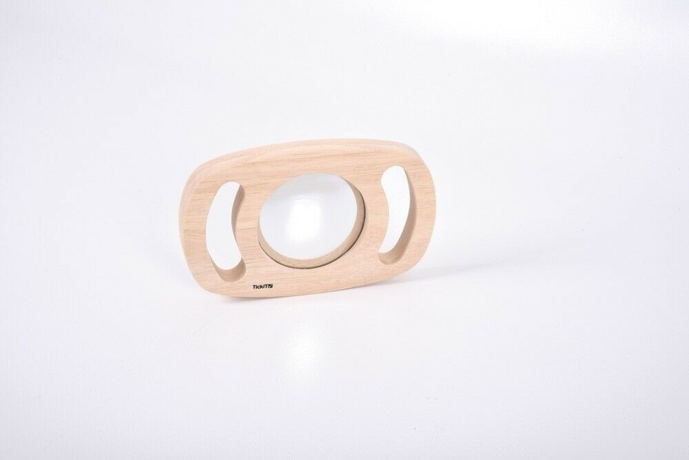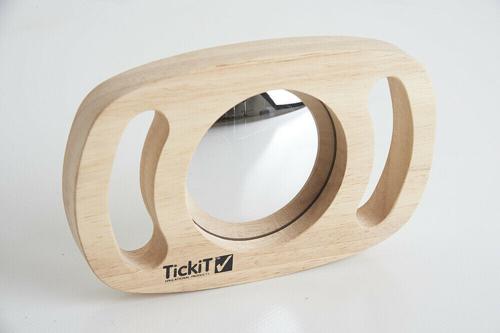 Rubberwood frame with easy grip handles enclosing a concave and convex mirror. These produce fascinating reflections - upside down, larger and smaller reflections depending on which side you look in. Bring the concave mirror up really close and it acts as a wonderful magnifying mirror.