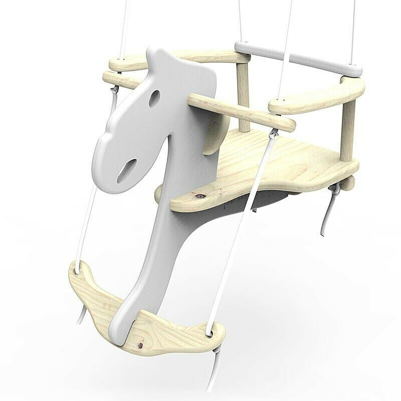 Wooden swing-horse with support for legs.