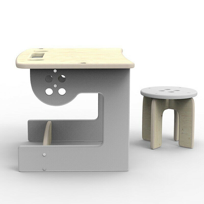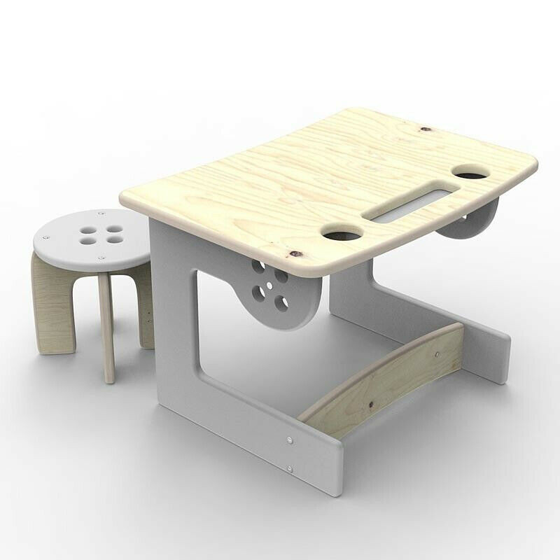 Wooden table with stool for playing and learning.