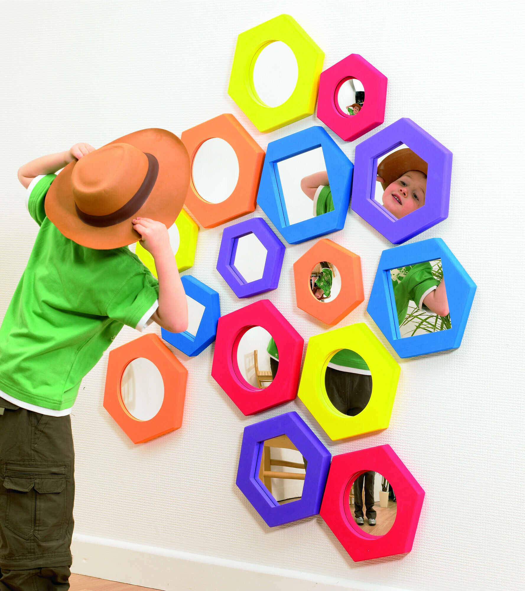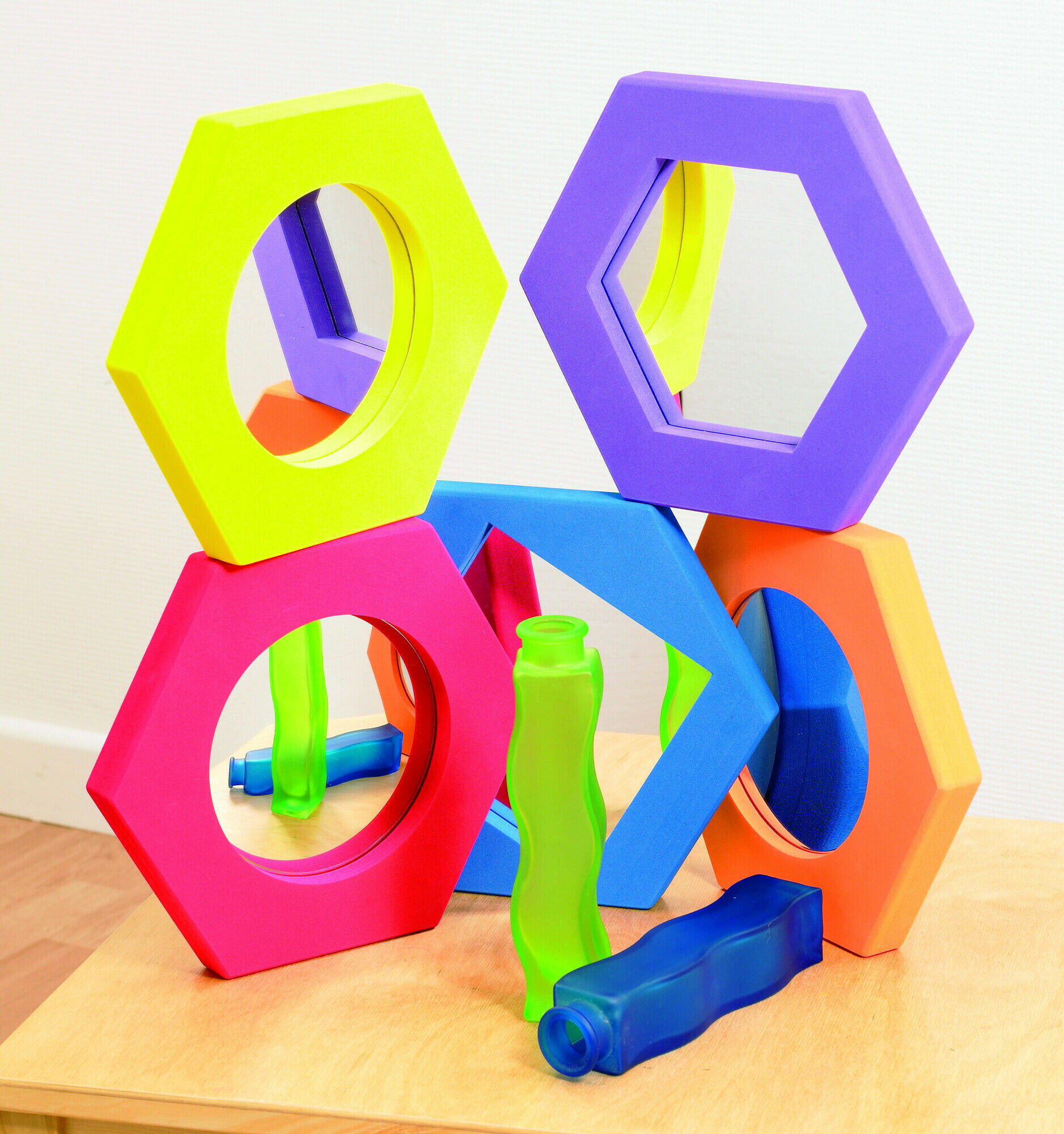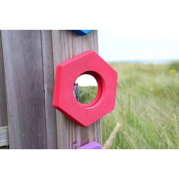 Set of 5 hand held, foam surround mirrors in plane (purple, blue and yellow) convex (red) and concave (orange). Like all Softies they have tough waterproof EVA foam frames surrounding safety acrylic mirrors. Includes adhesive pads for wall mounting.