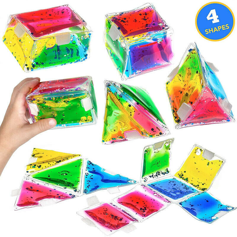 Set of 4 bright squidgy Geometric folding shapes, full of colorful liquid and glitter pieces giving that tactile squishy smoothness.