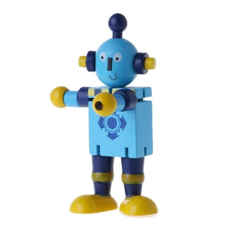 Small wooden robot is stained with safe paint, is non-toxic, has no odor and the hands, feet and head can be moved.
