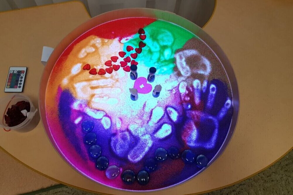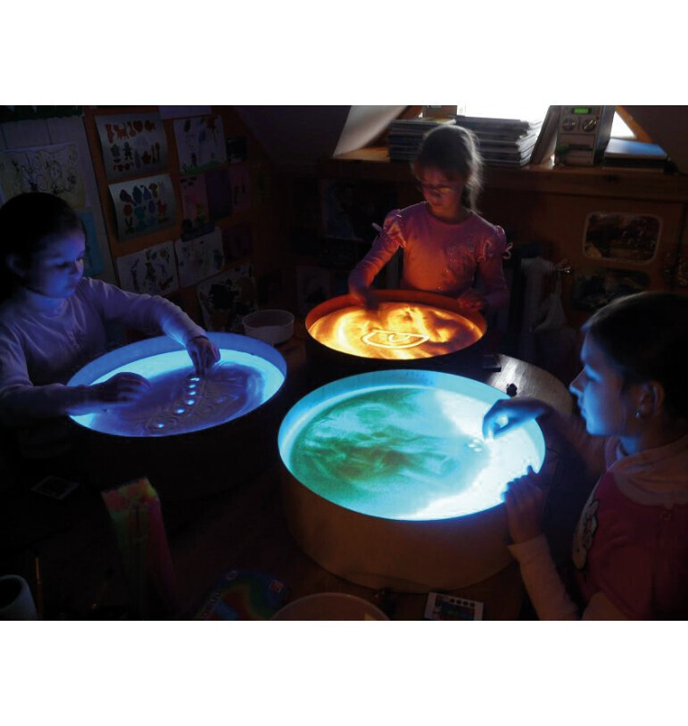 In addition, sand painting with fingers, brushes and spatulas promotes fine motor skills and concentration. The edge all around ensures that everything stays on the illuminated surface.