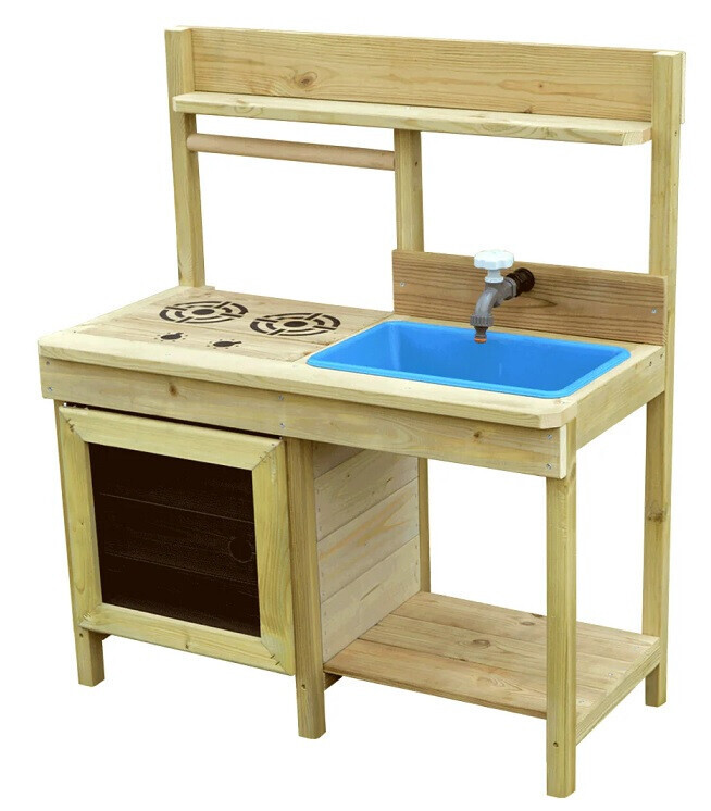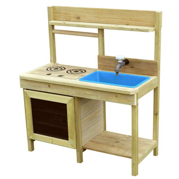 Equipped with a removable sink, functioning oven door, shelves, chalkboard and stencil set, it's ideal for gardens, schools, daycares, and home. Children can draw menus or logos, pretend to cook, and explore textures and nature in their own outdoor café.