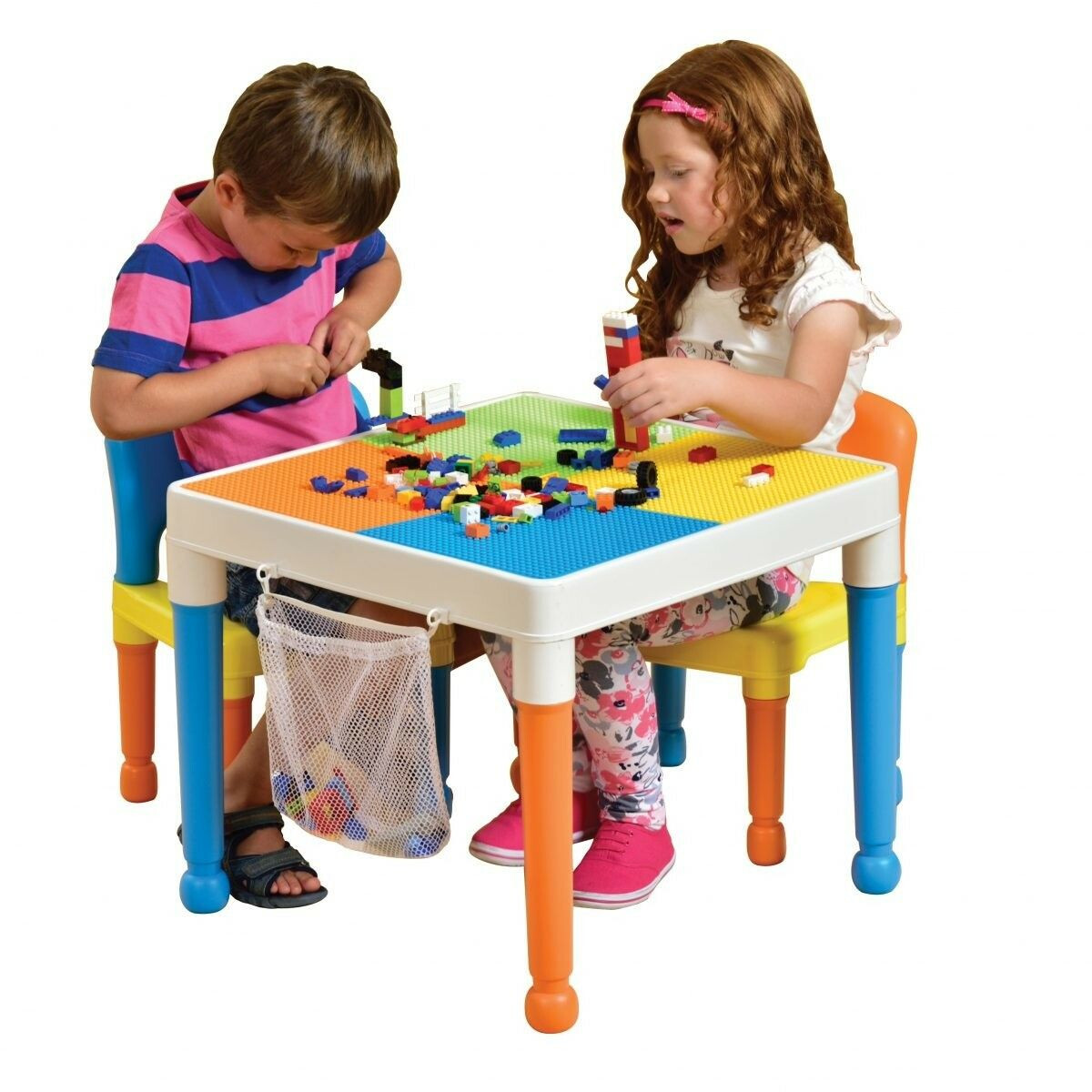 A multi purpose table that is ideal for younger children. There is a removable cover which provides a smooth surface suitable for drawing, painting, writing and picnicing, whilst the actual table top is a construction block base plate designed to fit all leading brands of building blocks (eg Lego). There is a handy storage bag on one side of the table. The table and 2 chairs are supplied flat packed and are easy to assemble
