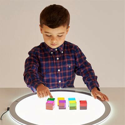 Holding two or three cubes together creates new colours and hues; using the cubes on a light panel or against a window will enhance the children’s opportunities for colour mixing. When looked through from different angles, children will see a variety of squares and rectangles within the cube, an effect caused by internal reflection of the outer edges.