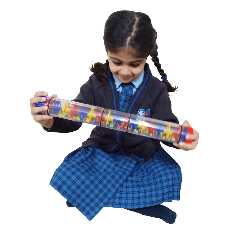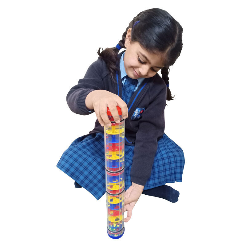 By gently tilting the tube, the beads fall and produce a soothing and pleasant sound similar to that of rain or falling water.