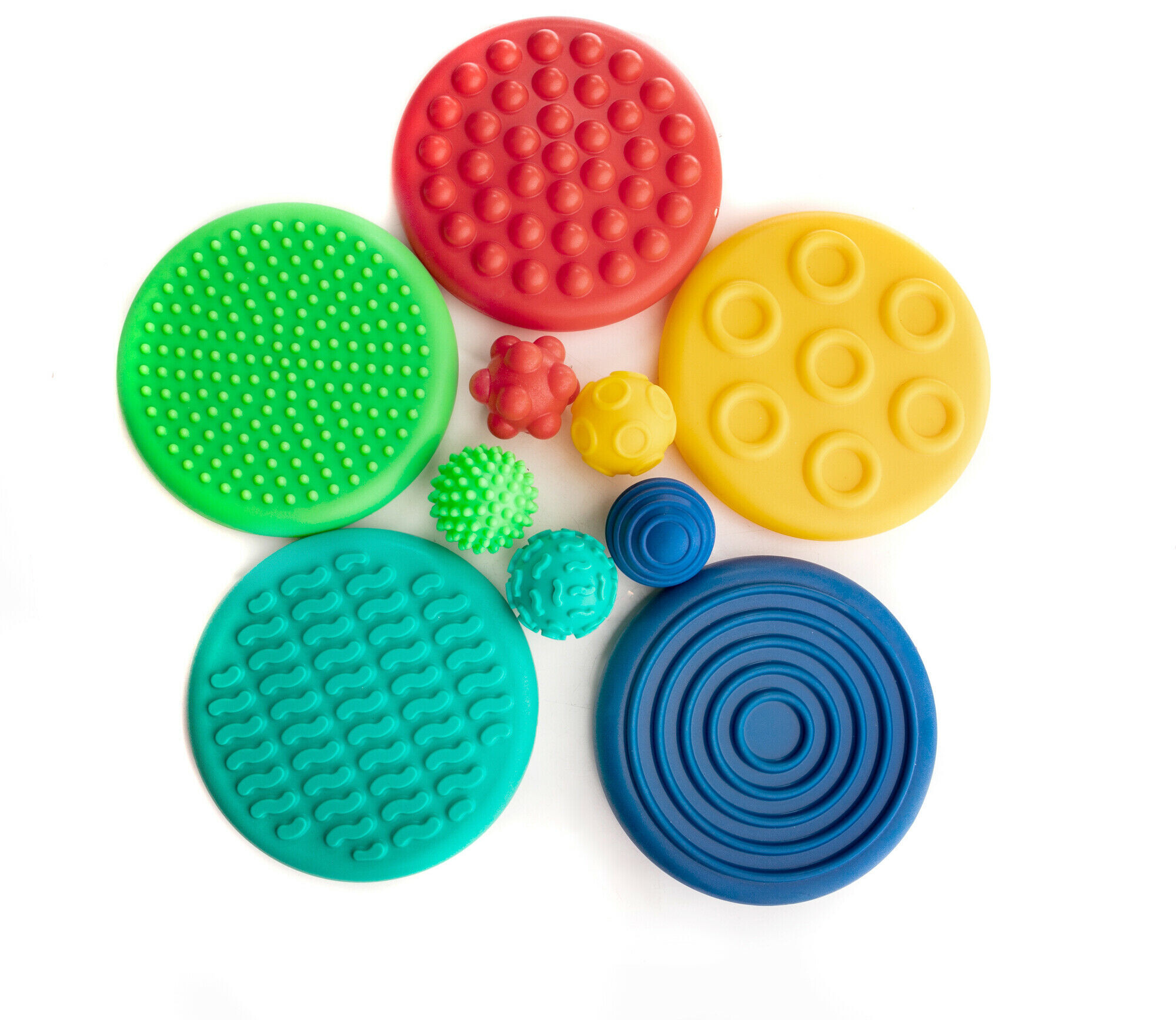 - Various disc and ball structures can help with desensitization of your child’s feet or hands.