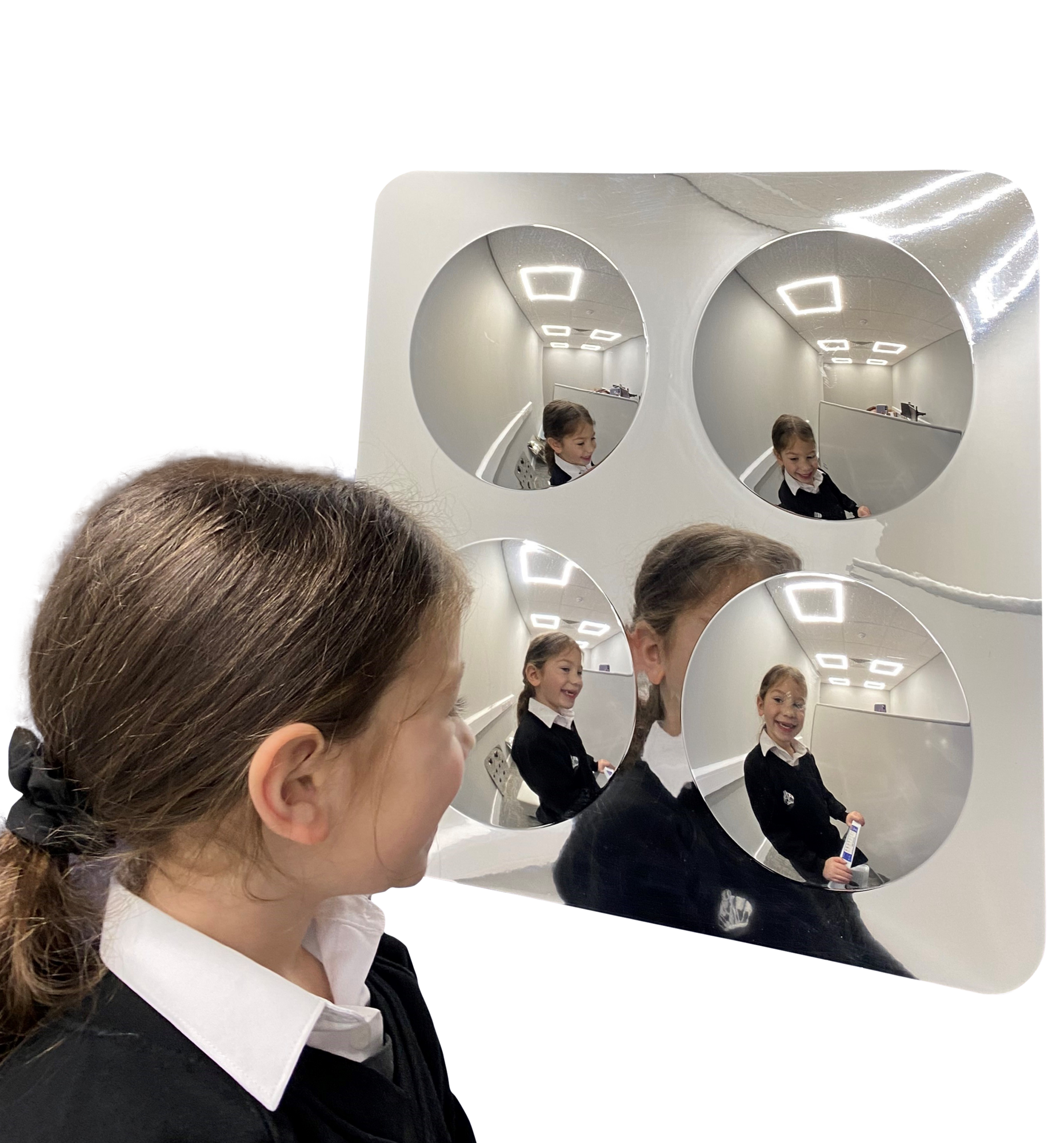 This set of 4 large sensory mirrors provides a fun and educational experience for children. Featuring varying bubble sizes (1 large bubble, 4 bubbles, 9 bubbles, and 16 bubbles), each mirror creates a unique and fascinating image that stimulates curiosity and engages the senses.