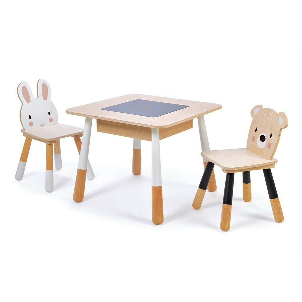 Complete your nursery with this nice table with chairs! The seats are in animal theme (rabbit and bear). The table has a hidden compartment with chalkboard. In this compartment you can store your blocks nicely!