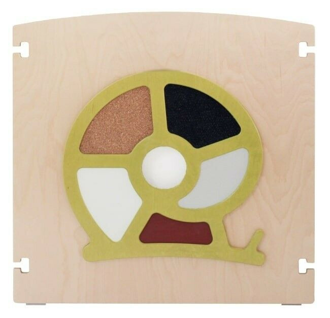The feeler snail particularly stimulates the child's sense of touch. 5 different materials are arranged as a snail and in the middle there is a plexiglass pane to see through. The properties of the individual segments are rough (sandpaper), smooth (white lacquer), warm (cork), soft (carpet), cold and wavy (corrugated iron). The properties of the materials can also be felt on the back.