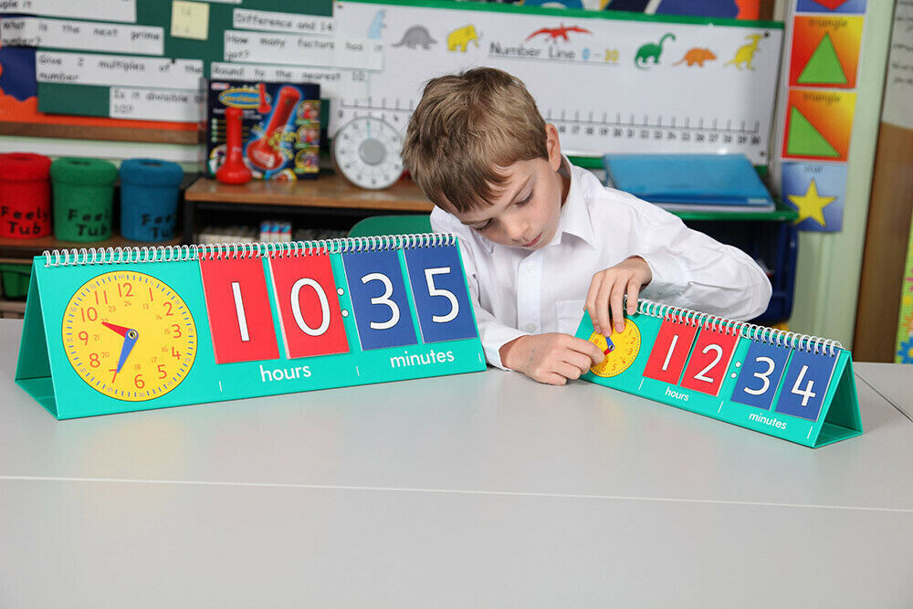Teach analogue and digital time effectively with these freestanding flip charts showing the 12 hour clock face and numbers for the 24 hour or 12 hour digital time. The clock face has movable colour coded hands, easy for children to coordinate the hands on the clock face and the time on the flip chart.
