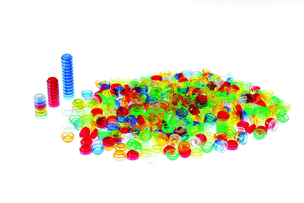 Translucent plastic counters in 6 colours that can be stacked into towers or used for counting, sorting, pattern-making and sequencing. Comes in a convenient storage container.