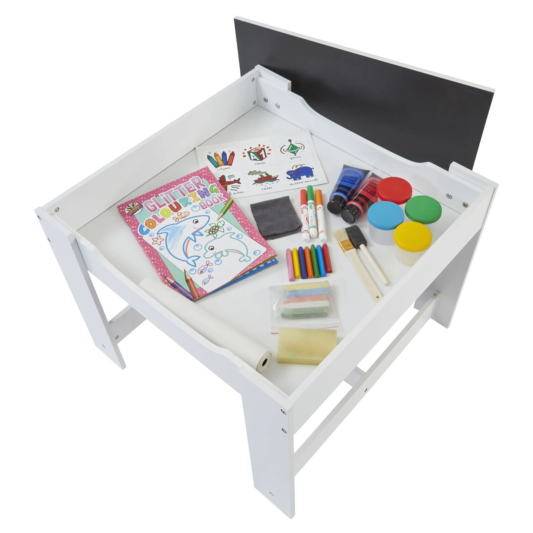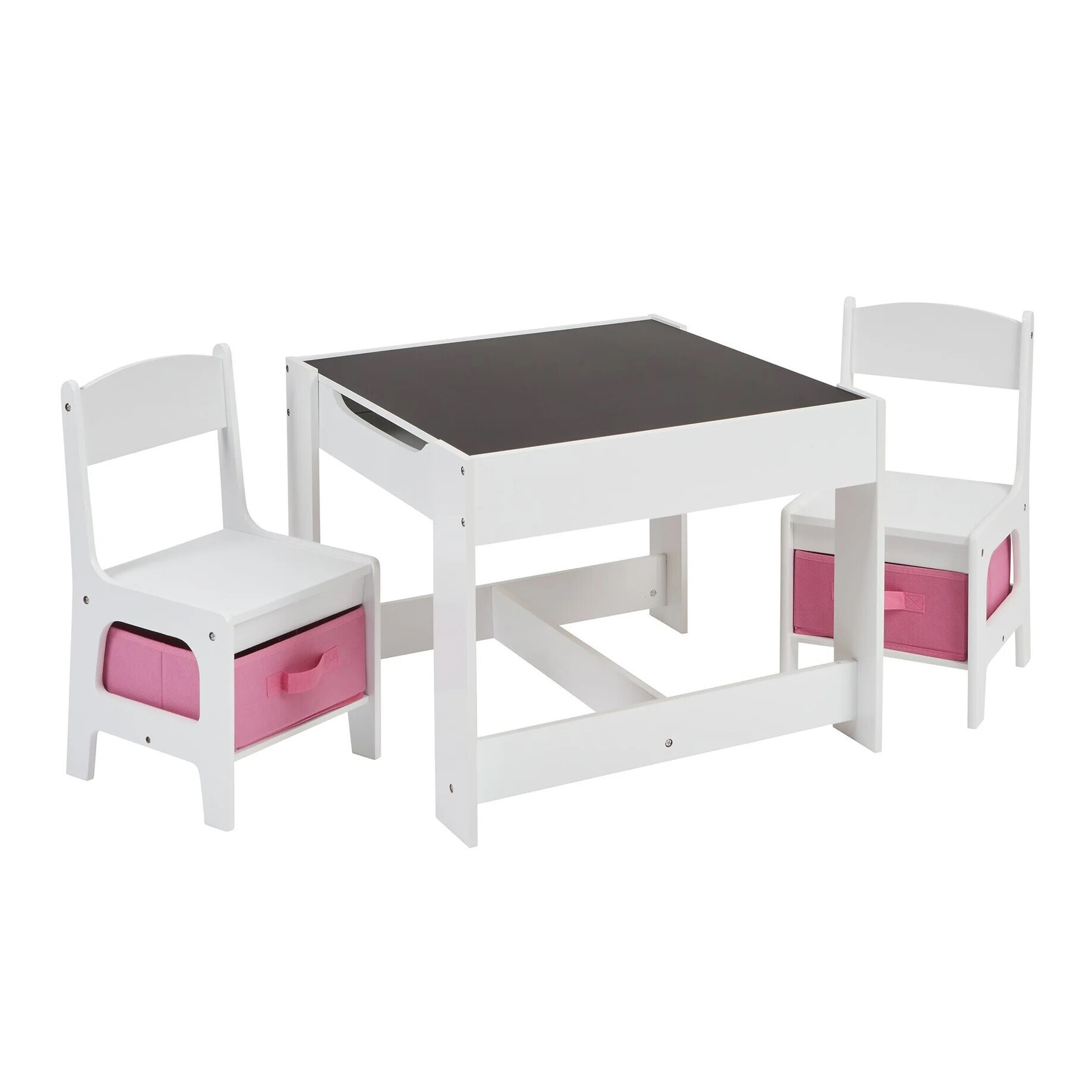 The white table and chair set includes slide-out pink woven fabric storage boxes within the chairs. Hideaway playthings while the children sit and play! Supplied flat-packed for easy adult assembly.