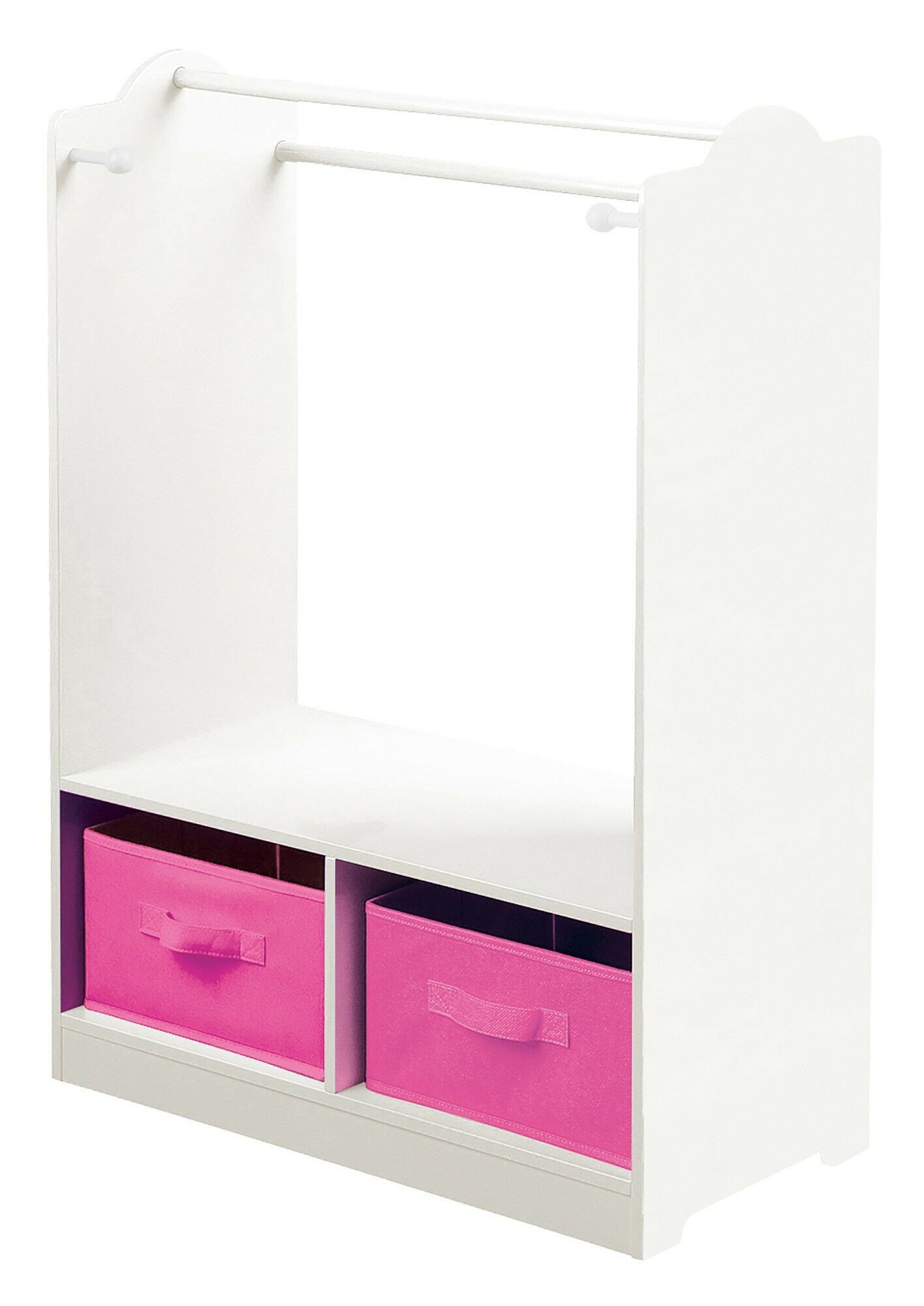 Pastels range white wooden dress up unit. Muted tones and pastel colours are the background for our Pastels range. This sturdy clean white dress up unit comes with two hanging rails and two pink woven fabric stroage bins providing ample storage for your little one to keep all of their favourite dress up pieces. Supplied flat packed for easy adult assembly.
