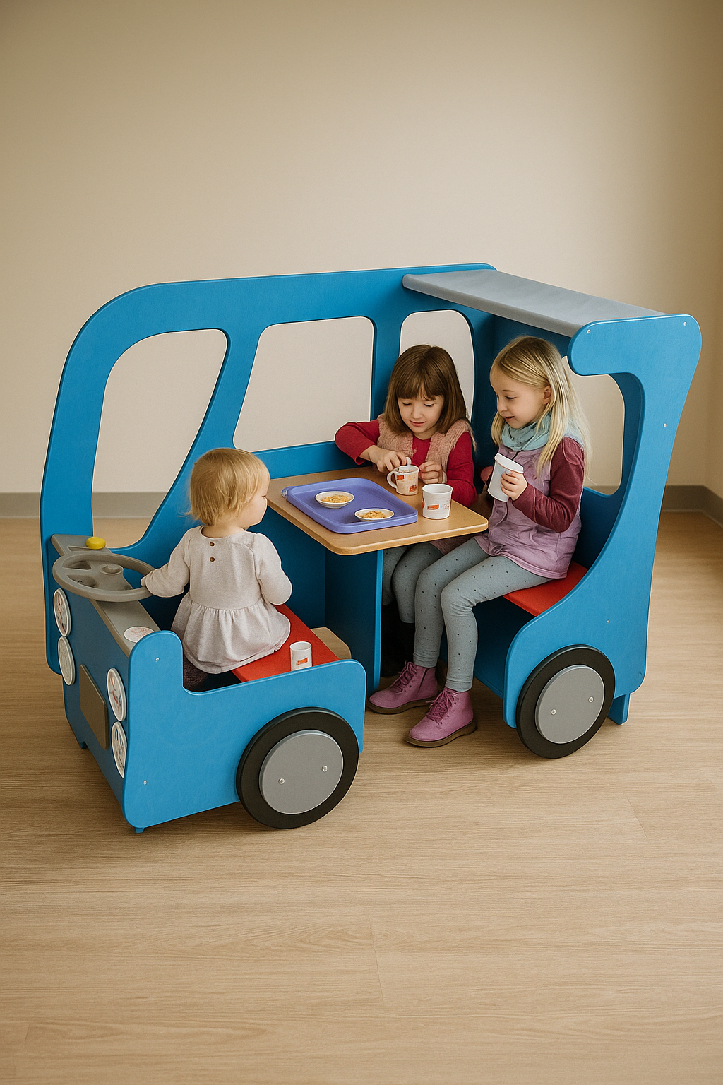 The Wooden Bus Play Corner is an interactive play bus inviting children to imaginative role play. Kids can pretend to go on holiday as a family, or act as school bus drivers transporting other children. Features include storage under the rear seat, a small table for painting, playing, or picnicking, rotating tables with light and colour effects, a movable gear lever, and steering wheel. Suitable for children aged 2–6 years.