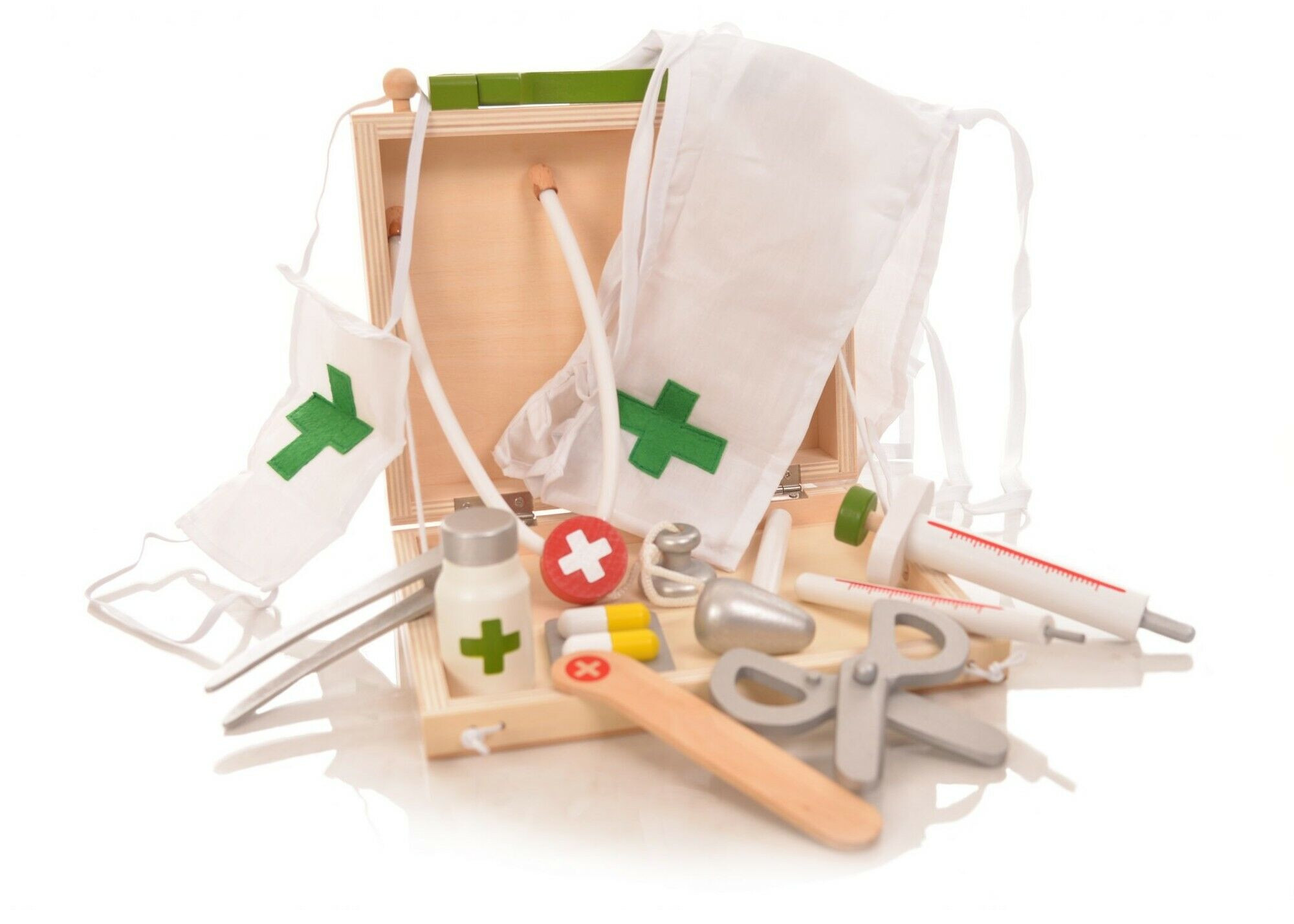 This children’s wooden doctor set comes with a handy wooden case which has a carry handle.