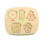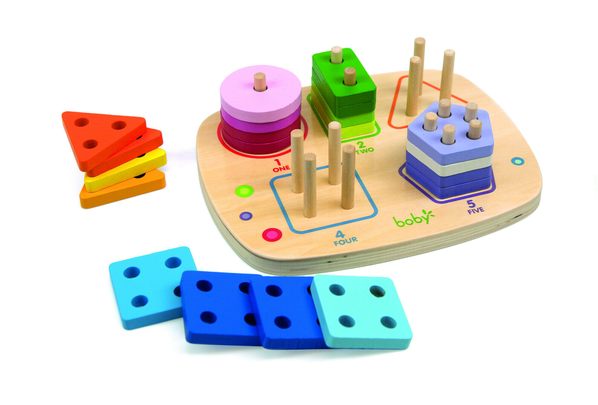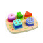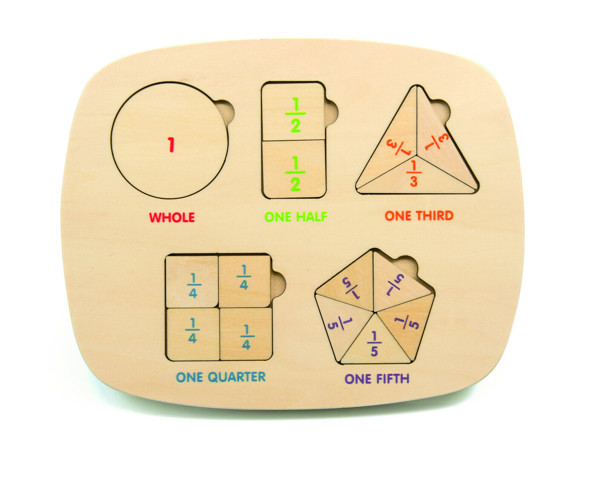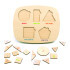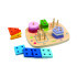 Classifier sorter of 20 pieces and 5 geometric shapes. Reversible base with fractions game from 1 to 5.