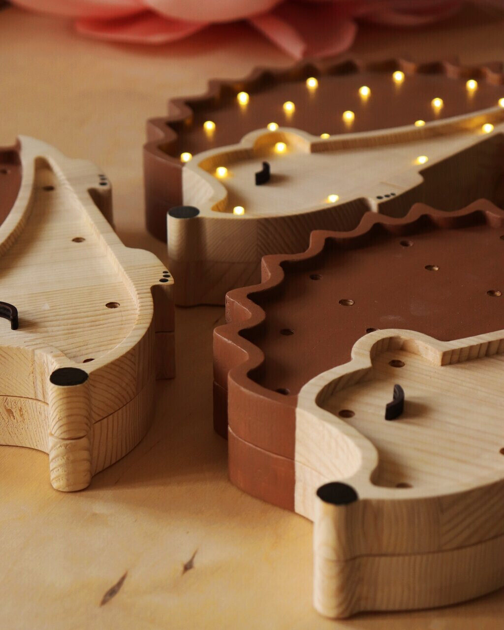 Discover this beautiful handmade wooden night lamp with LED lighting, perfect for any child's room. The lamp combines sophistication with inspiring shapes and seamlessly fits into various contemporary interior styles, adding just the right amount of charm to any space.